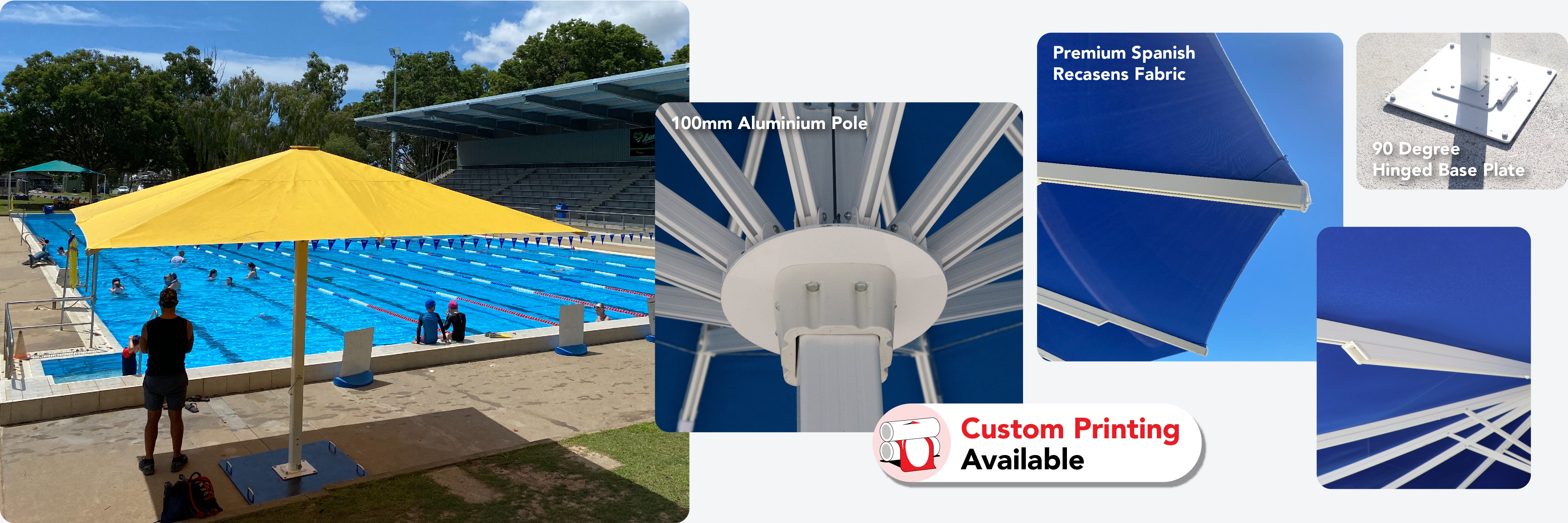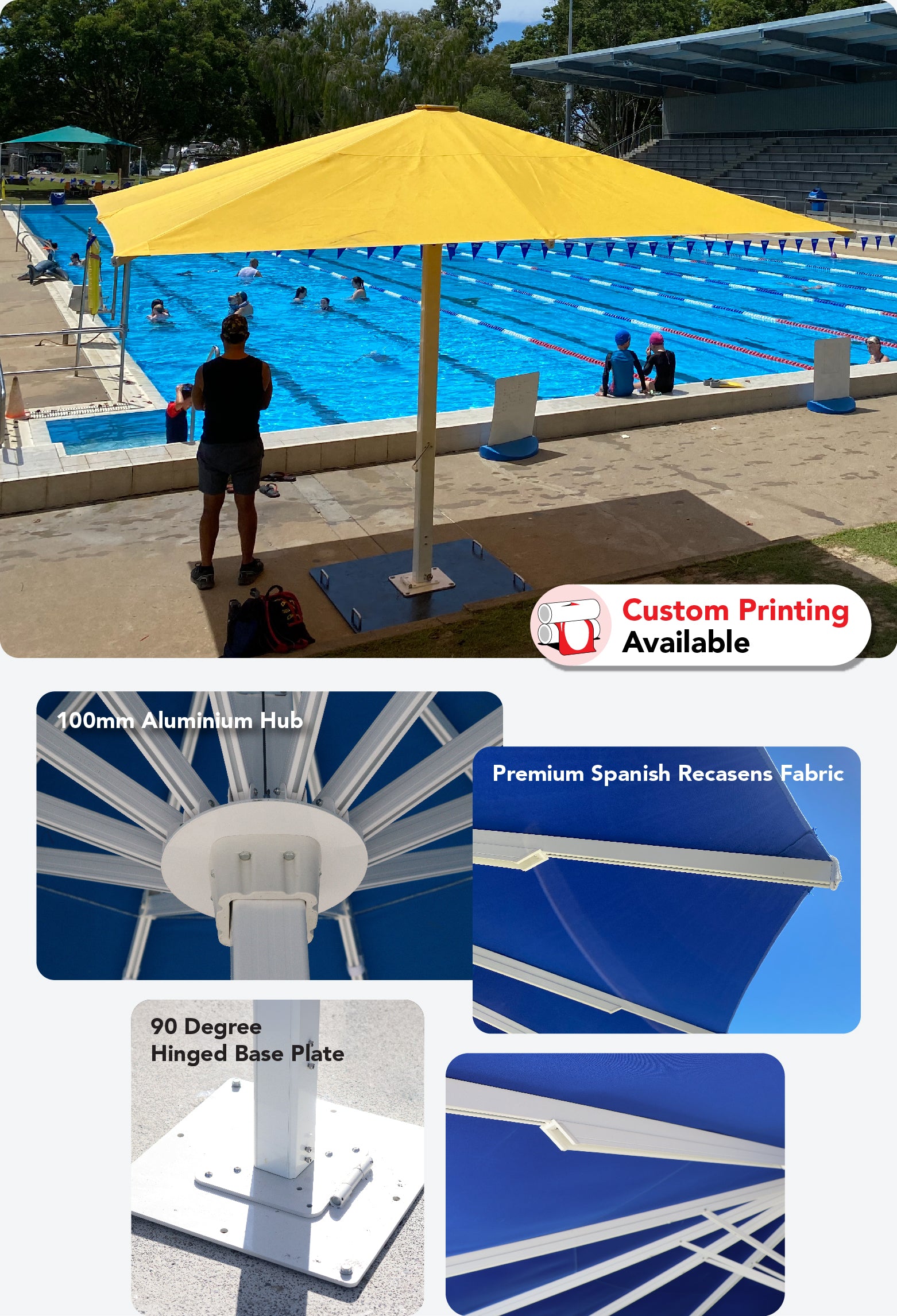 The Spanish 100 Series umbrella is a premium commercial grade umbrella engineered for strength, stability and effortless installation. Built with a unique 90-degree hinged base plate and a robust 100mm diameter pole, it delivers outstanding durability for high-traffic outdoor spaces. Featuring world-class Recasens fabric, this outdoor umbrella offers long-lasting performance, with custom printing available for logos, restaurants and resorts.