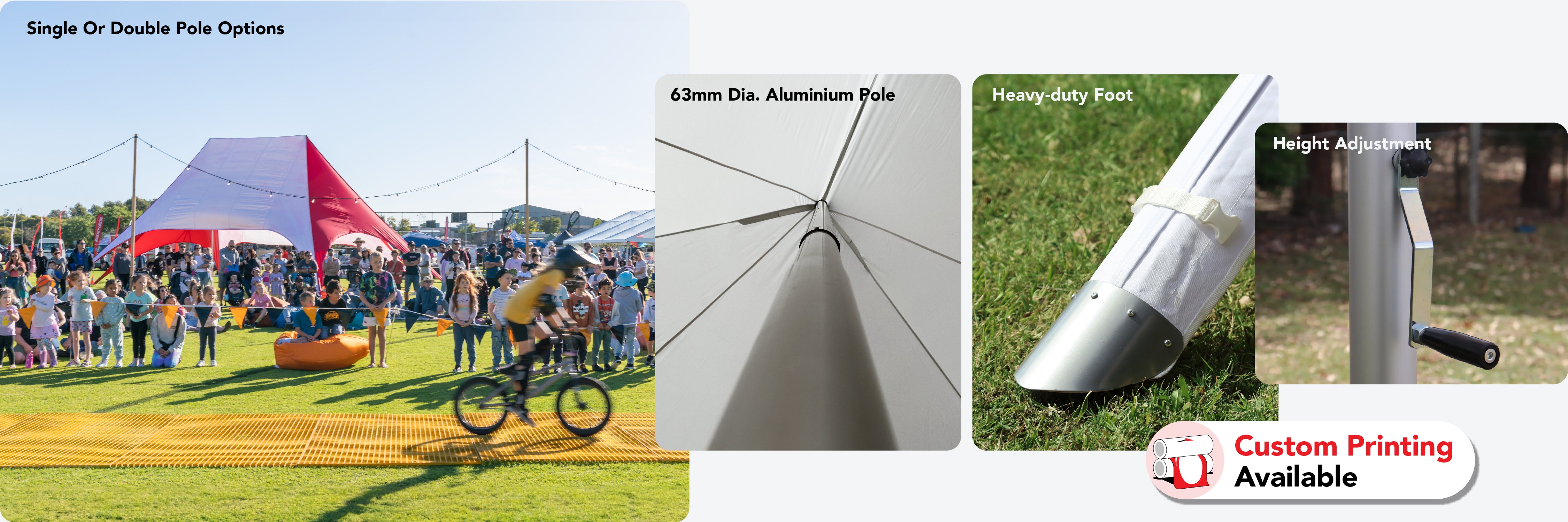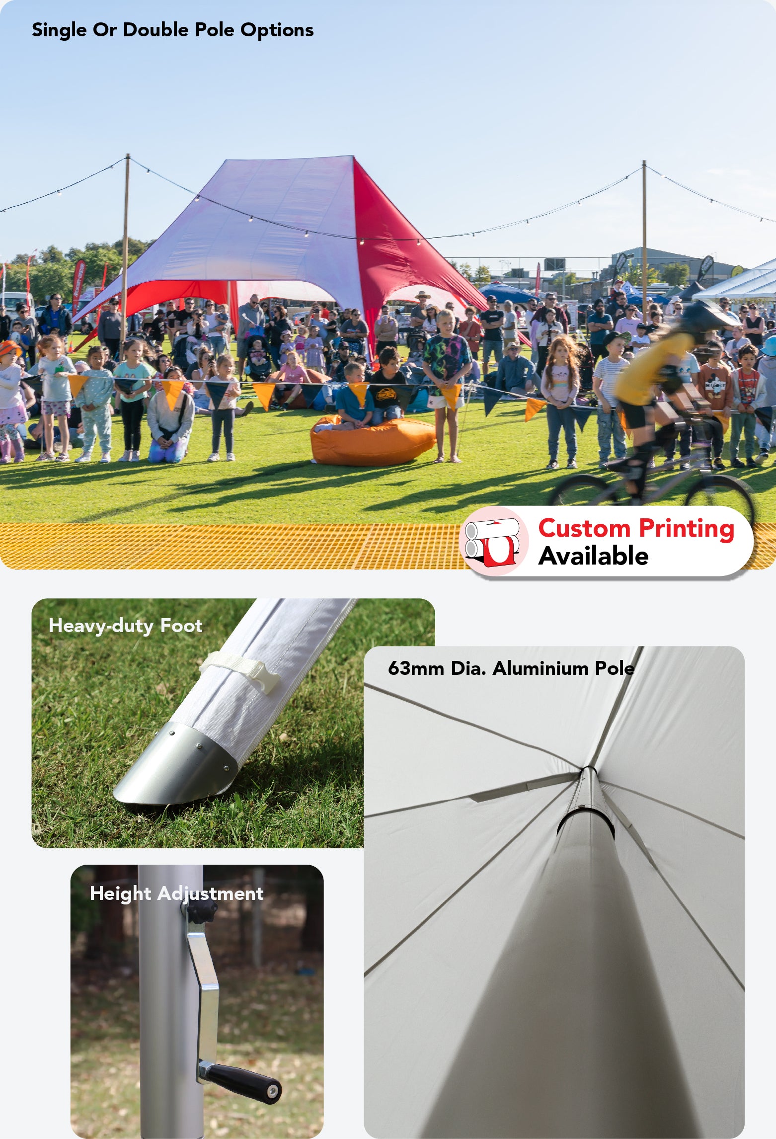 Extreme Marquees offers Australia’s widest range of outdoor star shade, star tents and custom branding solutions, delivering a practical, safe and stylish shading option for events and promotions. Available in single and double pole designs, our branded star shades help businesses stand out while promoting their logo or message. With a striking shape, vibrant colours and durable construction, these star tents provide reliable shade and protection from the harsh Australian climate, transforming any outdoor space into a comfortable, eye-catching setting.