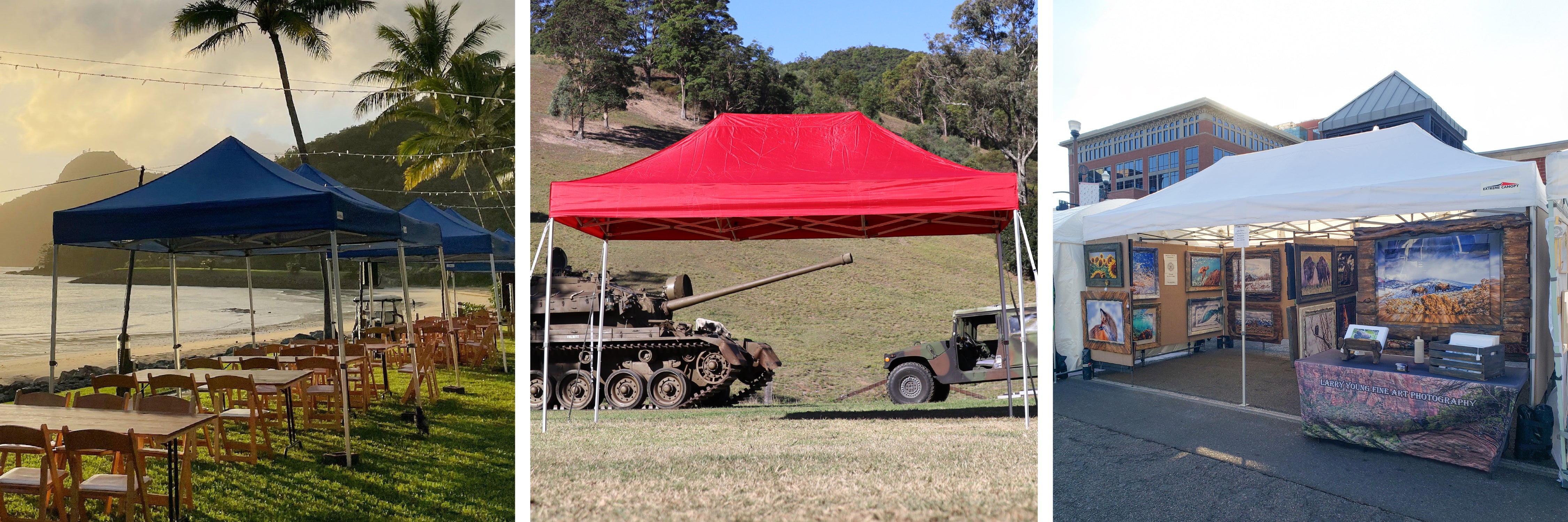 Package Includes: Marquee Frame, Polyester Roof Fabric, Wheeled Carry Bag, Tie Down Ropes, and Steel Pins.