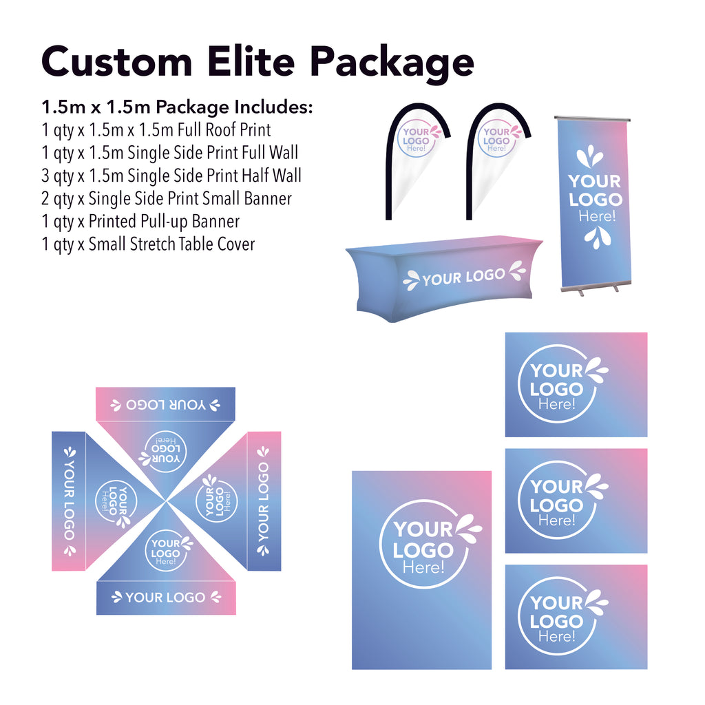 The 1.5m x 1.5m Printed Folding Marquee Custom Elite Package is crafted for businesses that want premium presentation and maximum brand visibility. This all-inclusive setup is perfect for trade shows, festivals, markets and corporate activations.