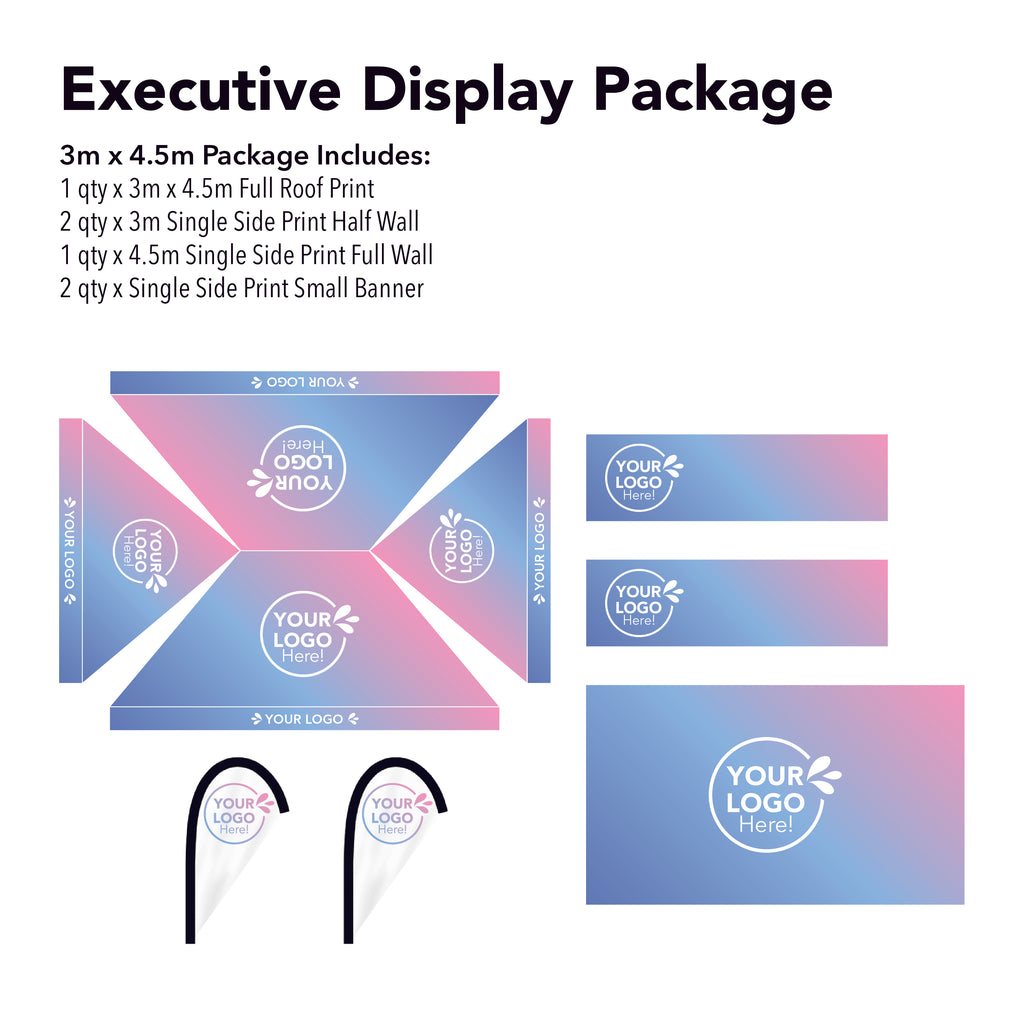 The 3m x 4.5m Printed Folding Marquee Executive Display Package delivers a complete event branding solution that maximizes your presence at trade shows, festivals and outdoor activations.