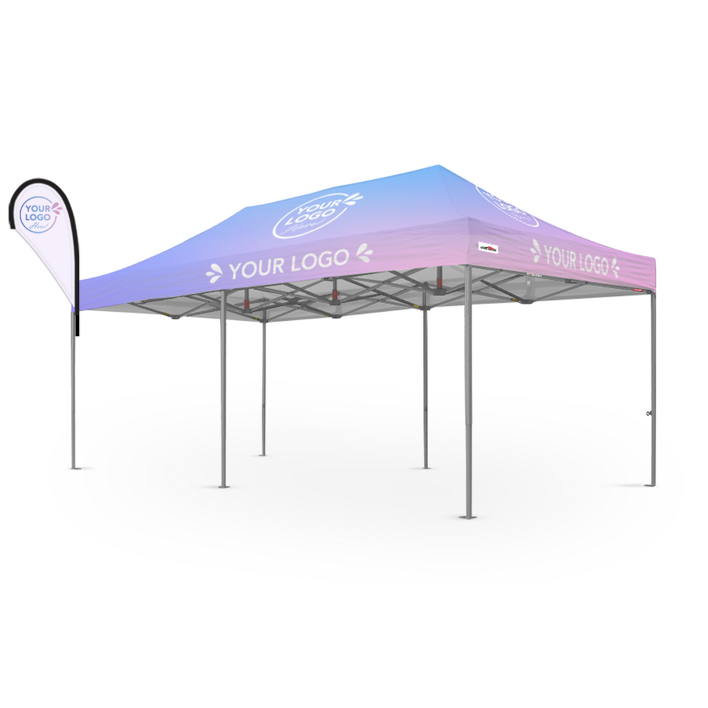 Package Includes: Fully Printed Roof, One Small Single Side Printed Flare or Wave Banner, Marquee Frame, Wheeled Carry Bag, Tie Down Ropes, and Steel Pins.