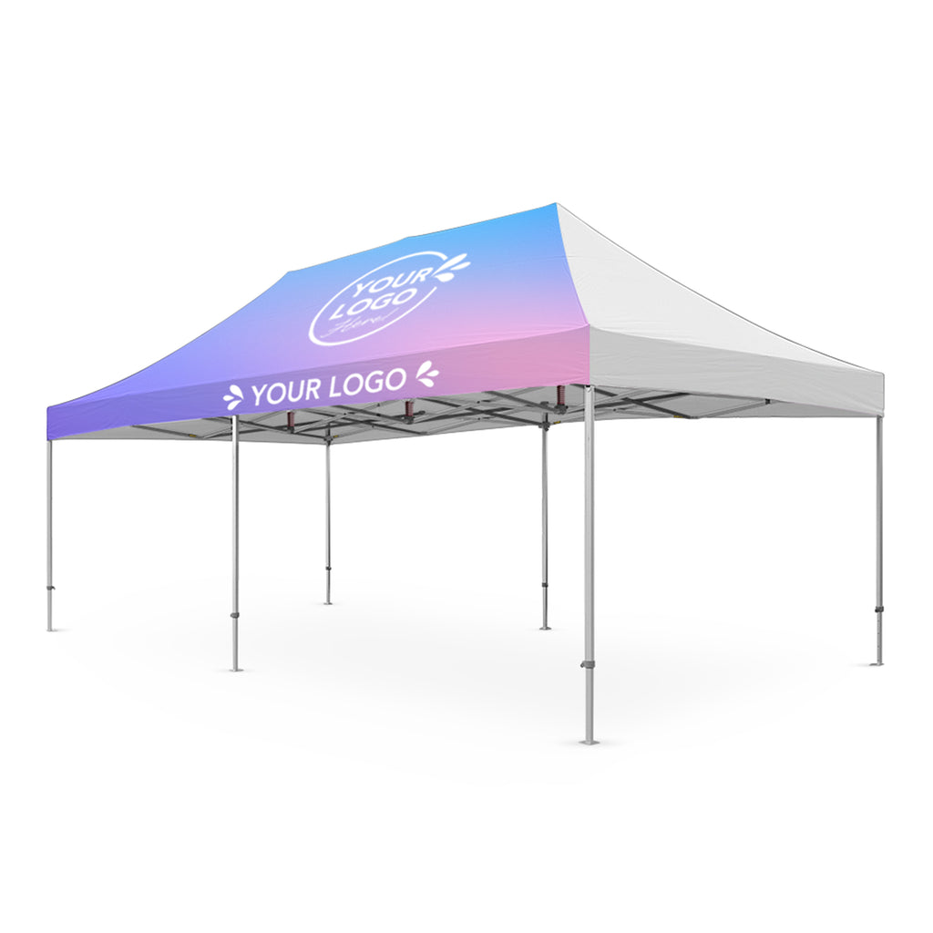 Package Includes: Fully Printed Roof, Marquee Frame, Wheeled Carry Bag, Tie Down Ropes, and Steel Pins.