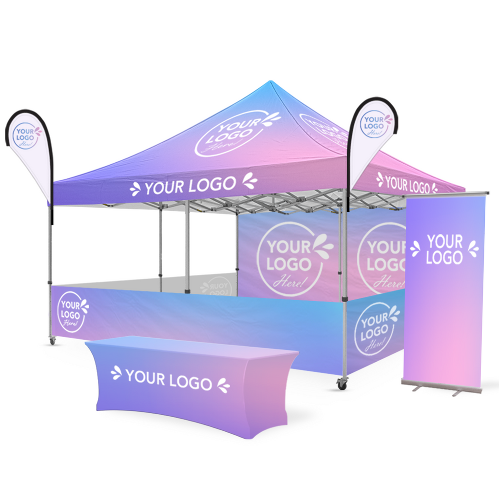 Package Includes: Fully Printed Roof, One 5m Single Side Printed Full Wall, Three 5m Single Side Printed Half Walls, Two Small Single Side Printed Flare or Wave Banners, One Pull-up Banner, One Small Custom Printed Stretch Table Cover, Marquee Frame, Wheeled Carry Bag, Tie Down Ropes, and Steel Pins.