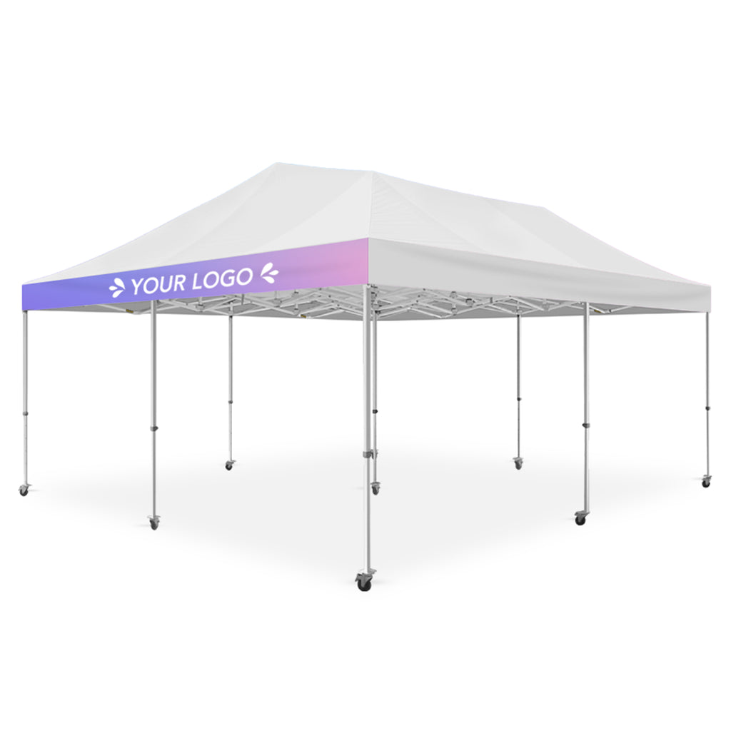 Package Includes: Fully Printed Roof, Marquee Frame, Wheeled Carry Bag, Tie Down Ropes, and Steel Pins.