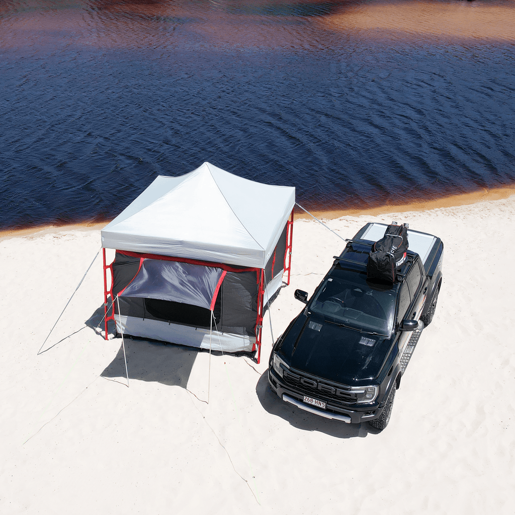 The Adventure Hanger is a lightweight, all-in-one solution designed to extend shade and improve organisation around your car awning. Easily attaching to Extreme Marquee 3x3m frames using the built-in hook and eyelet system, it functions as a smart alternative to marquee walls. With multiple tent pole points for doors and windows, it doubles as an awning to create extra shaded space for camping, events, and outdoor adventures.